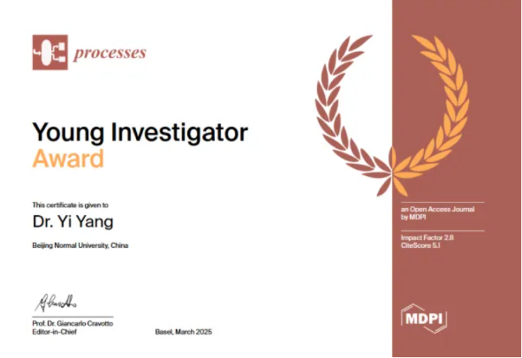 国际知名出版机构MDPI,旗下杂志Processes(SCIE, EI,SCOPUS等知名数据库收录)颁发了一年一度的青年研究者奖(Processes Young Investigator Award)。北京师范大学文理学院化学系教师杨逸表现突出,荣获此项殊荣。
