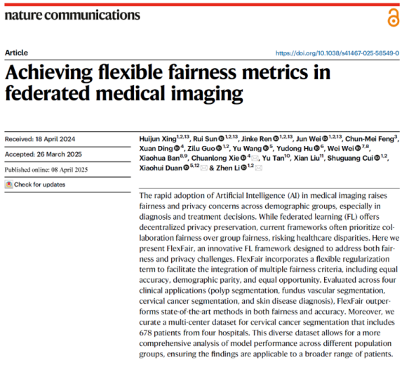 文理学院统计系副教授谢传龙与统计系研究生丁璇,联合中山大学孙逸仙纪念医院、香港中文大学(深圳)理工学院等机构,合作完成的研究成果“Achieving Flexible Fairness Metrics in Federated Medical Imaging”在Nature Communications上发表。