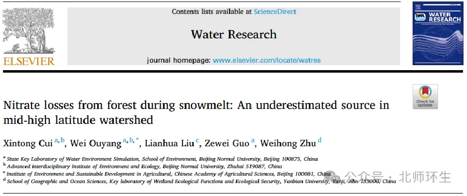 环境与生态前沿交叉研究院智慧流域团队博士生崔馨桐在环境领域高水平期刊Water Research上发表题为“Nitrate Losses from Forest During Snowmelt: An Underestimated Source in Mid-High Latitude Watershed”的学术论文,欧阳威教授为通讯作者。