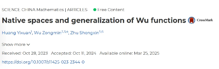 北京师范大学数学研究中心朱圣鑫课题组在数学类顶尖期刊Science China Mathematics发表题为“Native Spaces and Generalization of Wu Functions”的原创论文。吴函数的构造者、复旦大学吴宗敏教授,高度评价了该工作,认为本文是该领域三十年来最深刻的结论。