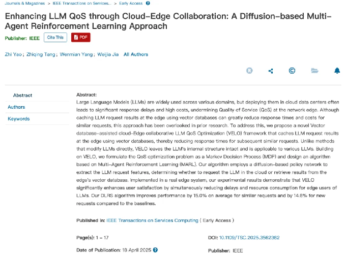AI与未来网络研究团队在云边协作大语言模型服务的工作“Enhancing LLM QoS through Cloud-Edge Collaboration: A Diffusion-based Multi-Agent Reinforcement Learning Approach”被计算机领域顶级国际期刊IEEE Transactions on Services Computing(以下简称TSC)录用。
