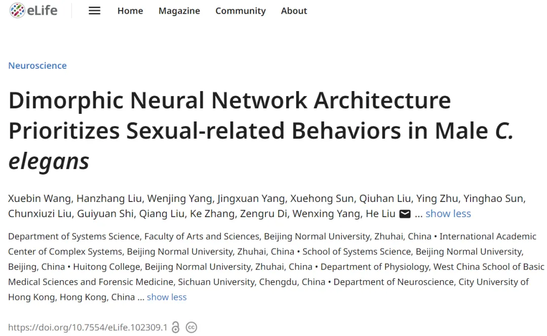 自然科学高等研究院复杂系统国际科学中心、北京师范大学文理学院系统科学系刘鹤研究员团队,联合四川大学华西基础医学与法医学院杨文星研究员团队以及香港城市大学神经科学系刘强教授,在国际权威期刊eLife上发表了题"Dimorphic Neural Network Architecture Prioritizes Sexual-related Behaviors in Male C. elegans"的研究论文,揭示了秀丽线虫性别二态性行为背后的神经环路,为理解全脑层面神经系统架构与功能输出之间的关系提供了重要见解。