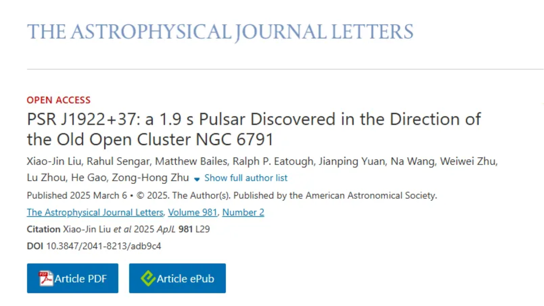 成果速递丨引力波与宇宙学实验室朱兴江团队发现首颗疑似疏散星团脉冲星