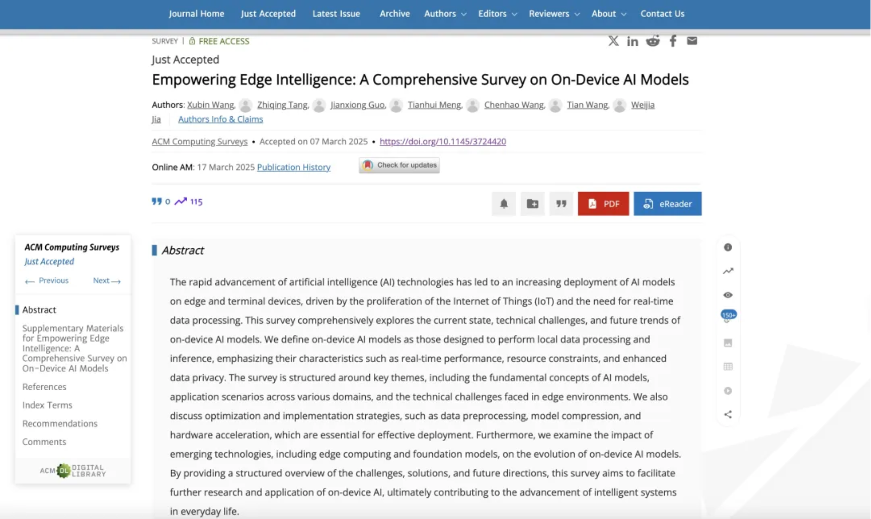 AI与未来网络研究院贾维嘉教授团队在设备端边缘智能方向的工作“Empowering Edge Intelligence: A Comprehensive Survey on On-Device Al Models”被计算机领域顶刊ACM Computing Surveys录用。