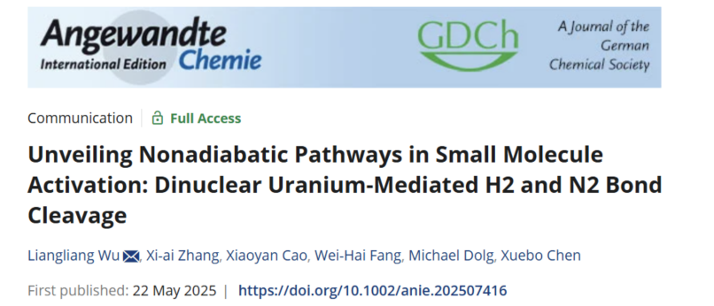 北京师范大学文理学院化学系吴亮亮特聘副研究员在国际化学领域顶级期刊Angewandte Chemie International Edition上发表题为“Unveiling Nonadiabatic Pathways in Small Molecule Activation: Dinuclear Uranium-Mediated H₂ and N₂ Bond Cleavage”的研究论文(Communication)。