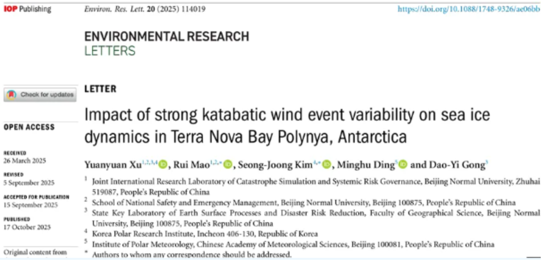 由北京师范大学国家安全与与应急管理学院毛睿教授团队联合中国气象科学研究院和韩国极地研究所于《环境研究快报》上发表了题为“Impact of strong katabatic wind event variability on sea ice dynamics in Terra Nova Bay Polynya, Antarctica” 的文章。该研究首次发现该区域强下降风事件增多,并系统揭示了南极特拉诺瓦湾冰间湖面积扩张与强下降风增强之间的直接联系,为理解南极海冰变化的大气驱动机制提供了关键证据。