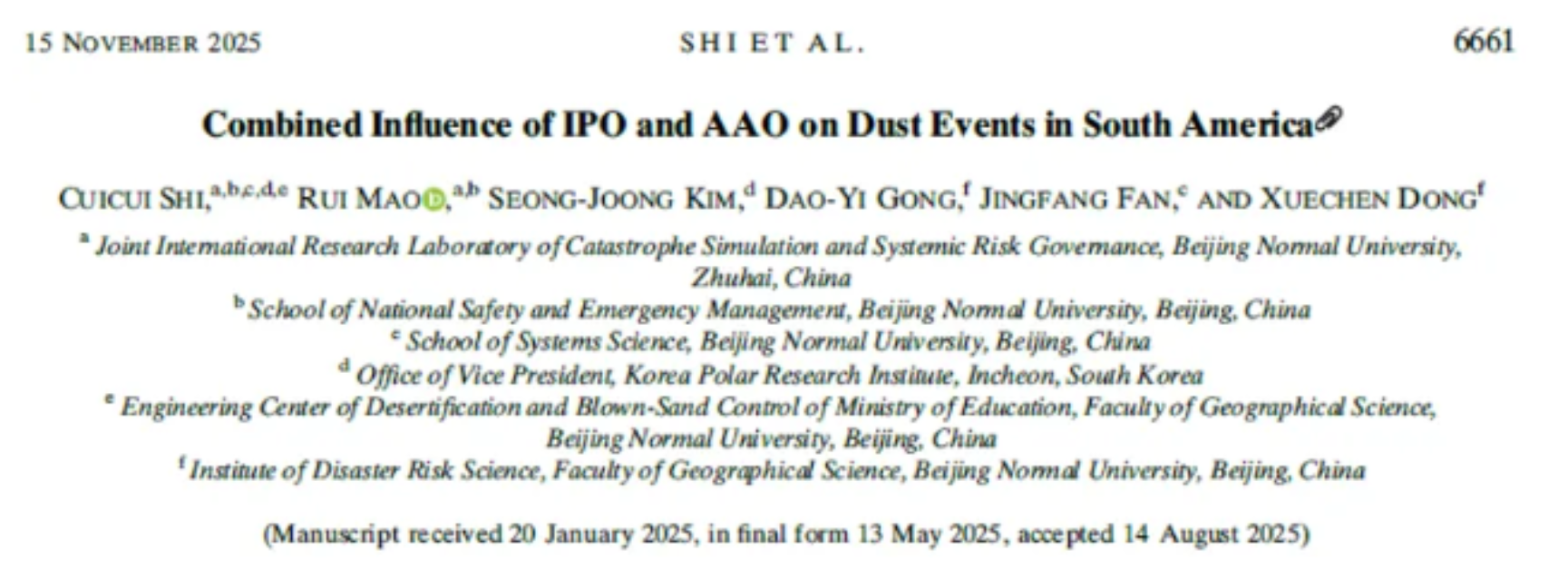 国家安全与应急管理学院毛睿教授团队在Journal of Climate发表题为 “Combined Influence of IPO and AAO on Dust Events in South America”的论文。北京师范大学教育部巨灾模拟与系统性风险应对国际合作联合实验室、国家安全与应急管理学院为论文的第一、二单位。该研究第一作者为毛睿教授团队博士生施翠翠,毛睿教授为通讯作者,韩国极地研究所Kim Seong-Joong教授、北京师范大学地学部龚道溢教授、系统科学学院樊京芳教授、地学部博士生董雪晨为共同作者。该研究受到国家自然科学基金项目(42330502、42450183、12275020等)、科技部项目(2023YFE0109000)和韩国极地研究所项目(KOPRI PE25030)以及北京师范大学防沙治沙教育部工程研究中心开放课题的共同资助。