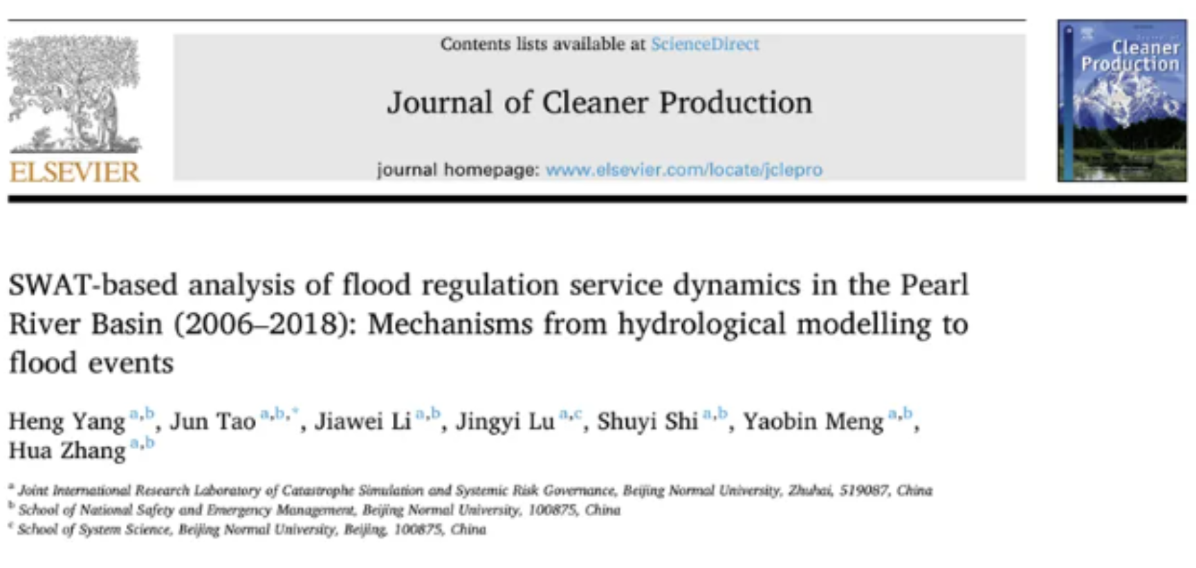 国家安全与应急管理学院陶军副教授团队在Journal of Cleaner Production期刊发表研究成果“SWAT-based analysis of flood regulation service dynamics in the Pearl River Basin (2006–2018): Mechanisms from hydrological modelling to flood events”,讨论了珠江流域洪水调节服务的时空动态、供需关系及其对实际洪水风险的影响。
