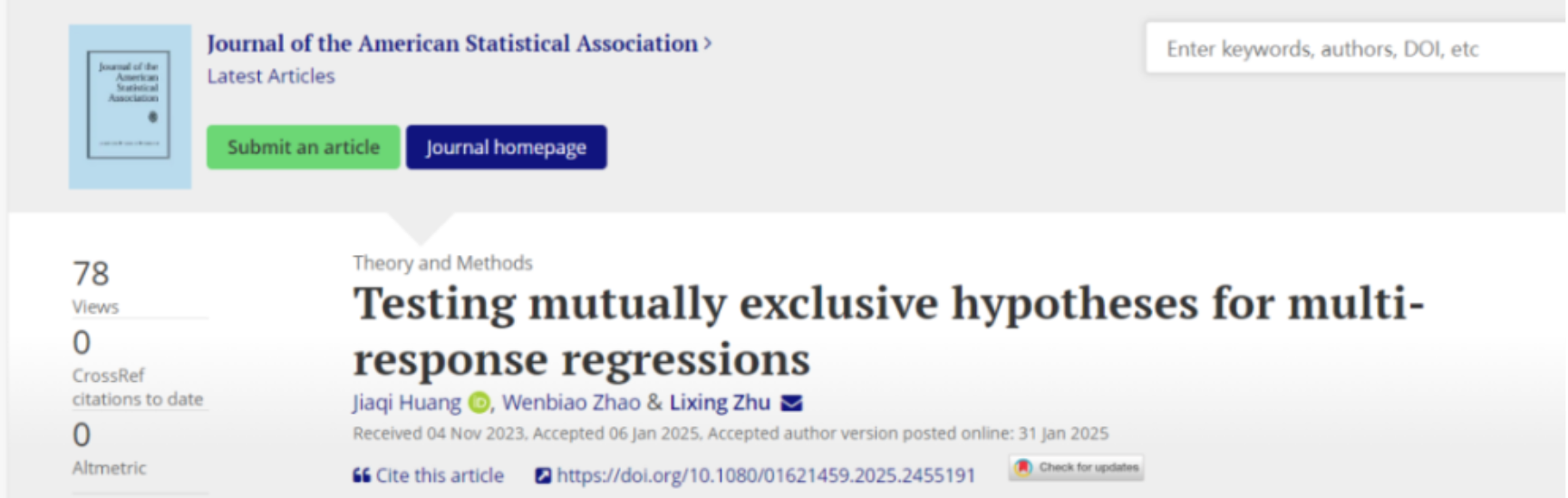 2020级统计专业博士生黄佳琦(第一作者)、中国矿业大学(北京)赵文标老师及北京师范大学文理学院统计系朱力行教授(通讯作者)合作的论文”Testing Mutually Exclusive Hypotheses for Multi-Response Regressions”在学术期刊Journal of the American Statistical Association(简称JASA)在线发表。JASA被公认为统计学领域四个国际顶级期刊之一。