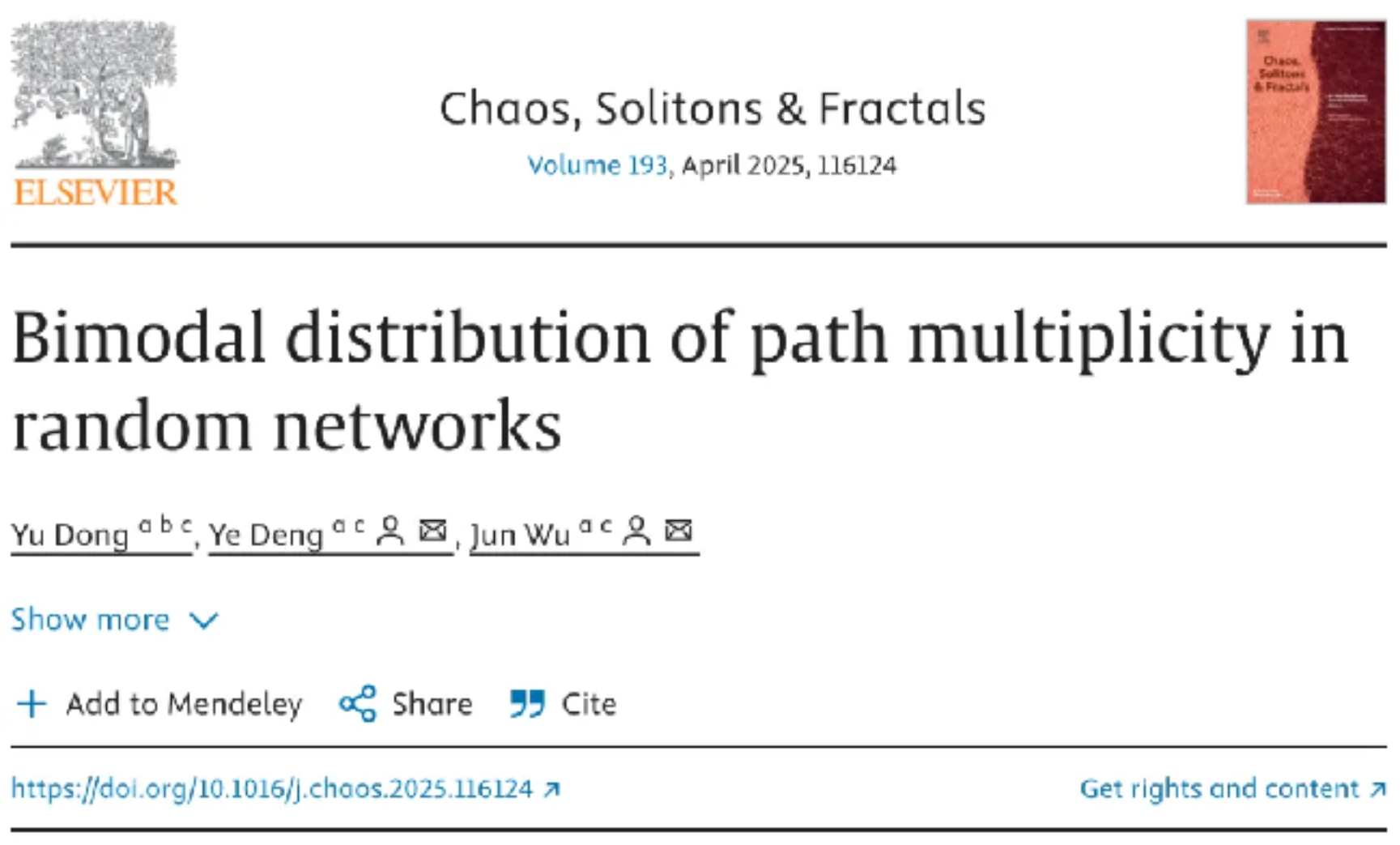 北京师范大学自然科学高等研究院复杂系统国际科学中心/文理学院系统科学系吴俊教授团队在国际权威期刊Chaos, Solitons & Fractals上发表了题为“Bimodal Distribution of Path Multiplicity in Random Networks”的学术论文。首次揭示Erdős-Rényi(ER)随机网络中路径多重性的双峰分布特征,并发现了ER随机网络中两个新的理论极值点,为网络科学基础理论研究提供了新视角。