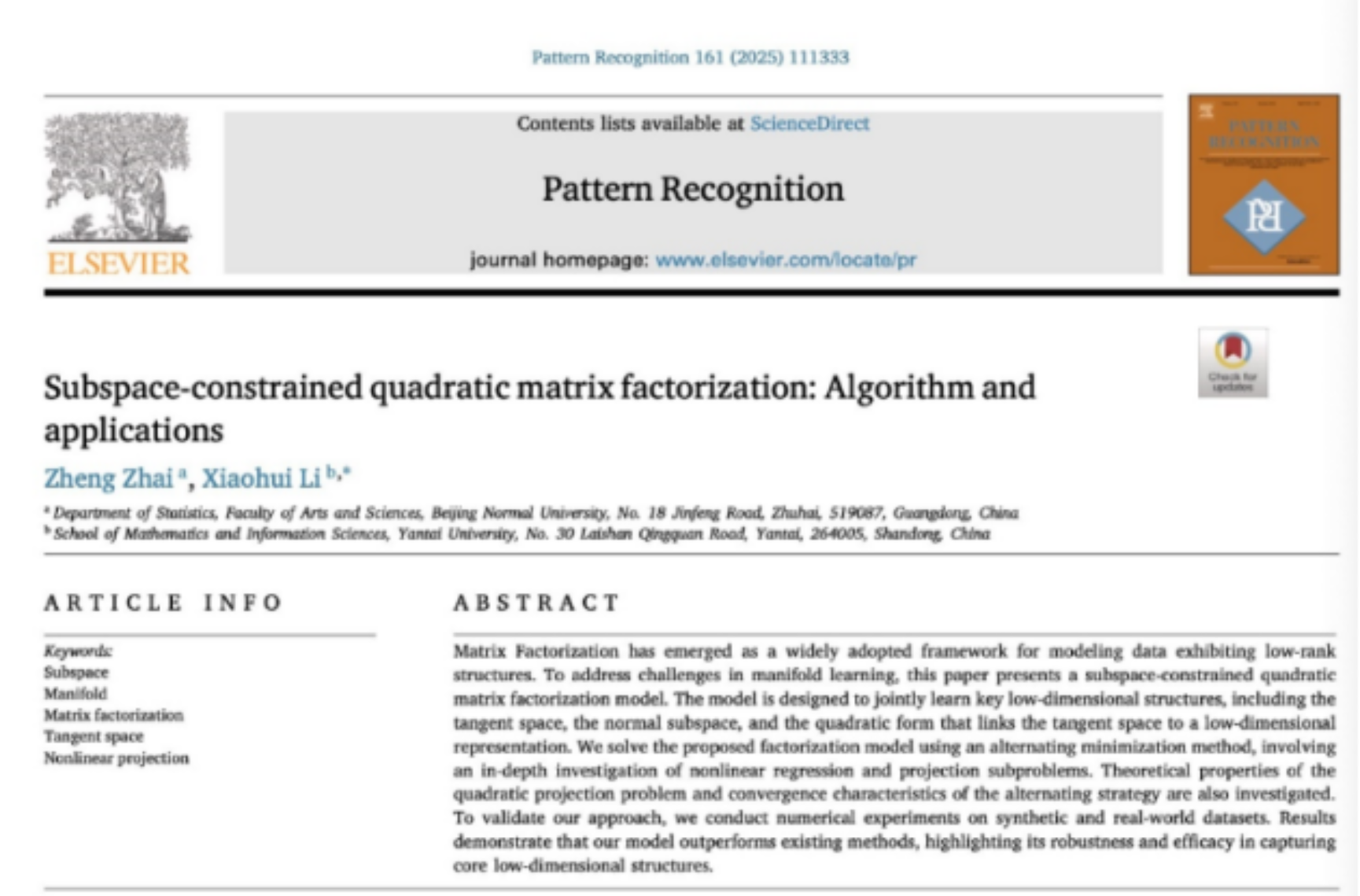 文理学院统计系翟铮博士及合作者的文章“Subspace-constrained quadratic matrix factorization: Algorithm and applications”在模式识别与人工智能领域顶级学术期刊Pattern Recognition(简称PR)长文发表。