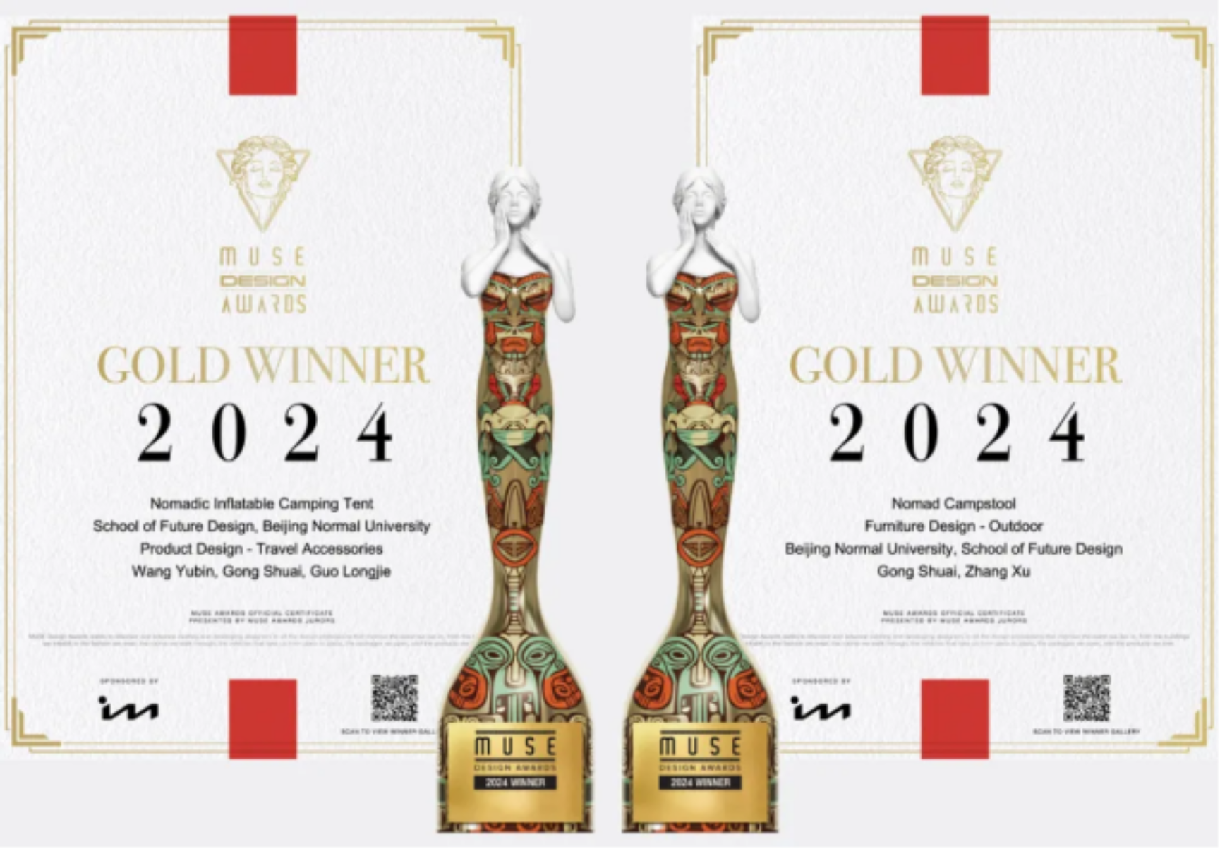 日前,全球设计领域最具影响力的奖项之一“美国缪斯设计奖(MUSE Awards)”公布获奖名单。由北京师范大学未来设计学院教师宫帅带领学生王宇彬、张旭、郭龙杰创作的作品“充气露营帐篷”“游牧三脚凳”分别获得2024年美国缪斯设计奖“旅行产品设计”类别及“户外家具设计”类别金奖。