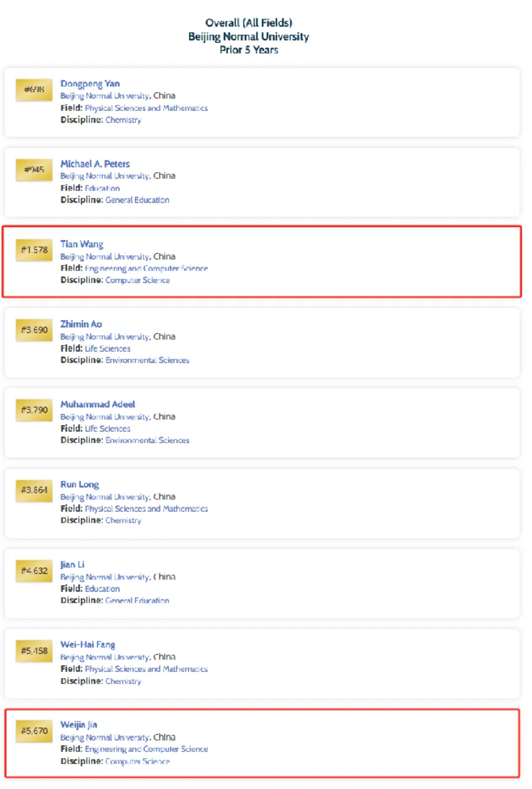 国际学术机构ScholarGPS发布2024年全球前0.05%顶尖科学家榜单。北京师范大学自然科学高等研究院人工智能与未来网络研究院贾维嘉教授、王田教授入选近五年全球前0.05%顶尖科学家榜单。