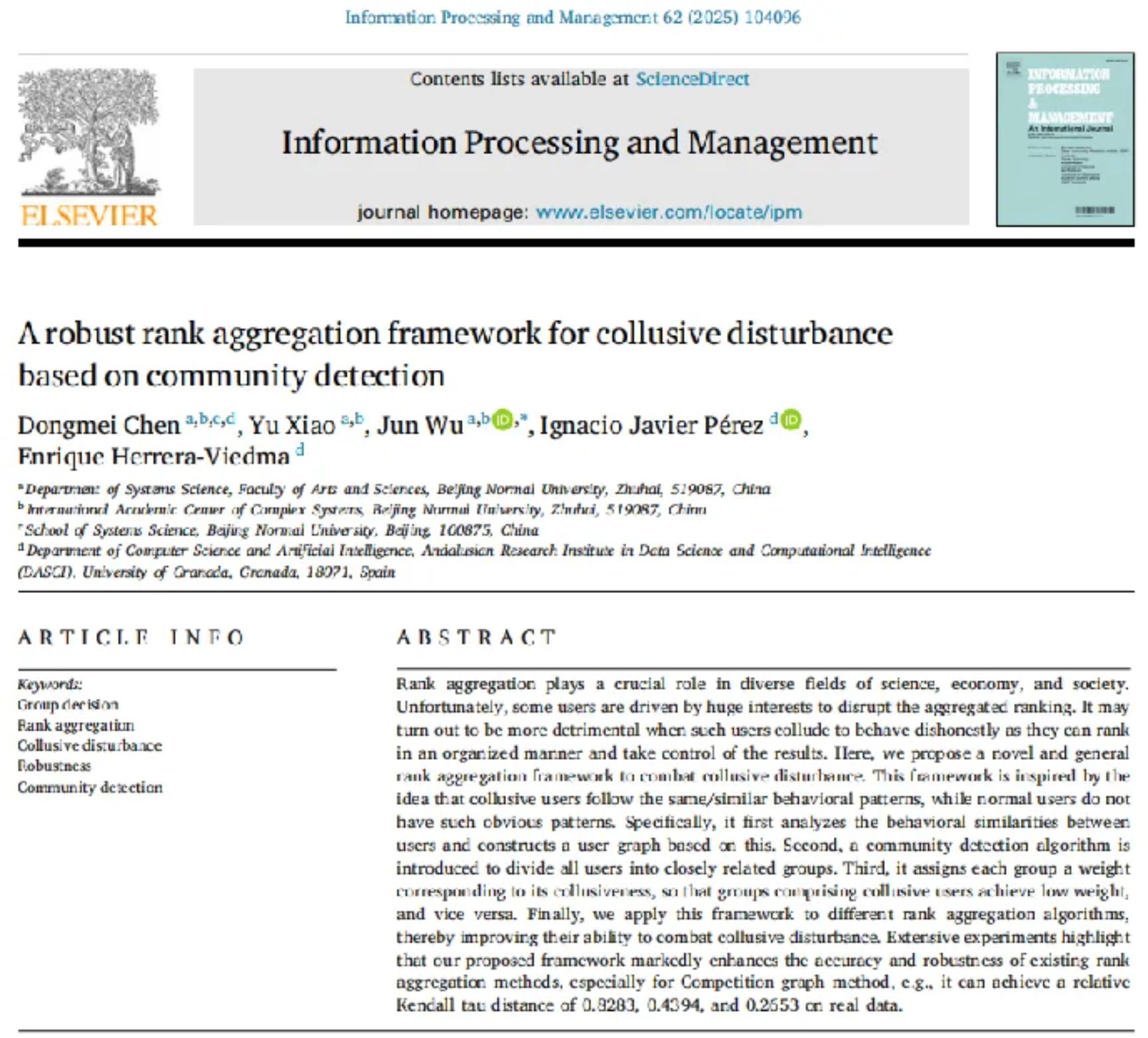 北京师范大学文理学院系统科学系自然科学高等研究院复杂系统国际科学中心吴俊教授团队联合西班牙格拉纳达大学研究人员在国际权威期刊Information Processing & Management发表了题为“A robust rank aggregation framework for collusive disturbance based on community detection”的研究论文,为破解群体决策中的信息干扰难题提供了创新途径。